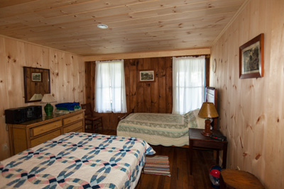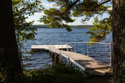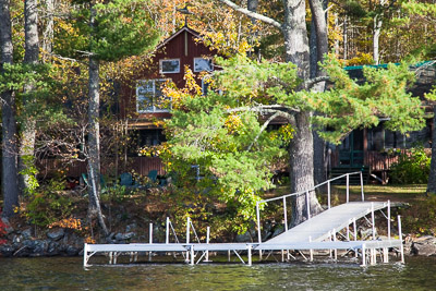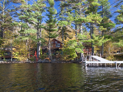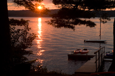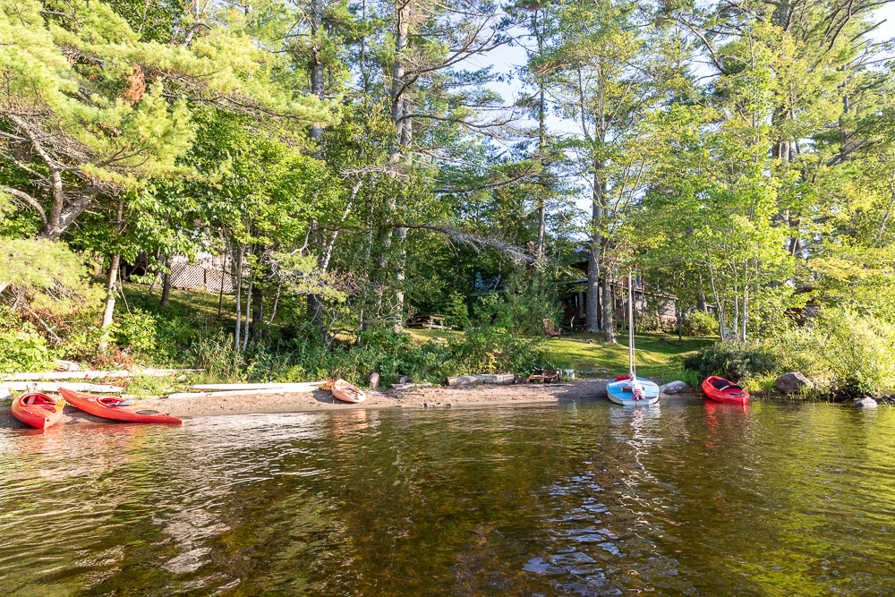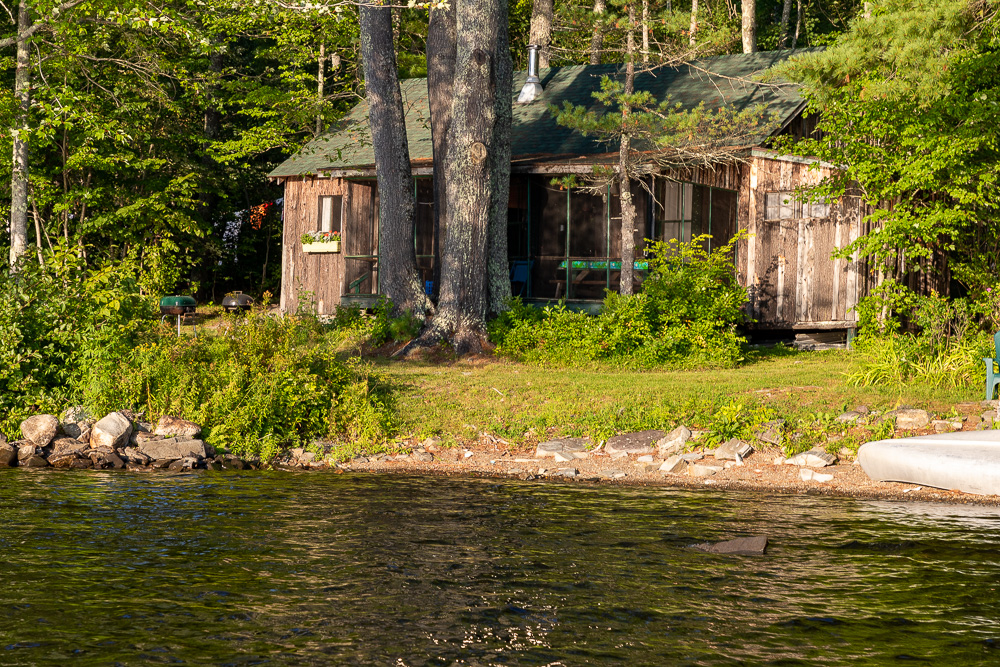 Sunset Lodge is a perfect place for families or larger groups to retreat together from the crowds and pressure of everyday life. The Lodge and surrounding four cabins sit on the waterfront in a grove of trees on a slight outcropping of land near the widest part of the lake, where the water deepens quickly (eventually reaching 114 feet) making it ideal for fishing and swimming. The property has 510 feet of water frontage. Originally built in 1919, on an ideal site for water views and fishing, the buildings sit close to the water, offering beautiful views of the lake, the far shore and the stunning sunsets. Large lawns next to the water are great for games and the two large docks are ideal for swimming and boating.