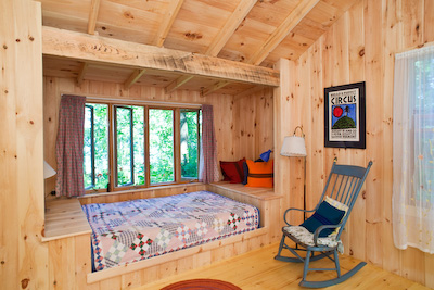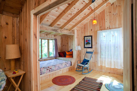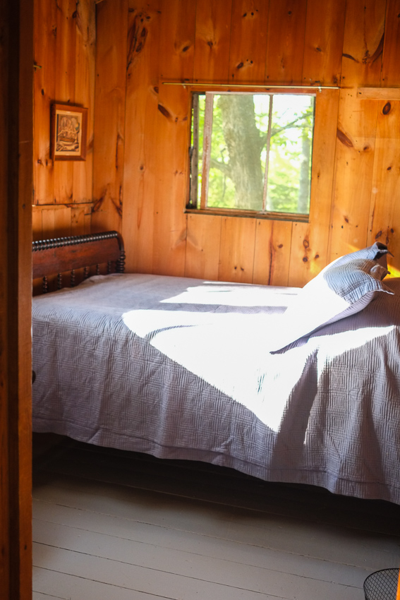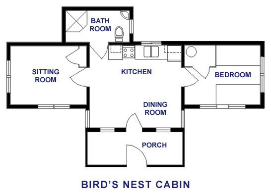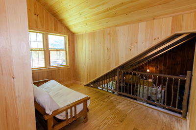 Bird's Nest Cabin is a 460 sq. ft. cabin with one bedroom, a sitting room, a kitchen and bathroom. A 75 sq. ft. screened porch overlooks the lake and grounds. There is no wood stove so we do not recommend it in October.