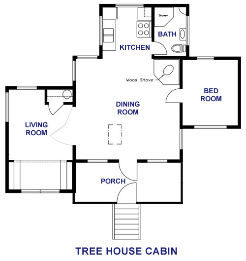 Tree House Cabin is a 625 sq.ft. cabin with kitchen, living area and bedroom. With a screened porch with views of the lake next to an outside shower.