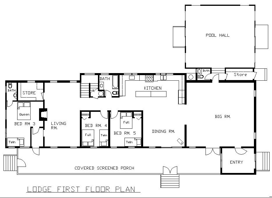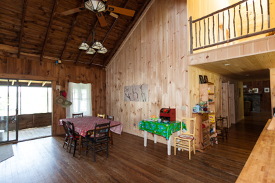 The Lodge is 4000 sq. ft.with an 80' long, 765 sq. ft screened porch and is just steps from the lake. It has five bedrooms and four bathrooms. All the bedroms face the lake. There is a large kitchen with two refrigerators, two dishwashers and a restaurant stove, a large common room for lounging and game room with a pool and ping-pong table. It has a dock and boat moorings.